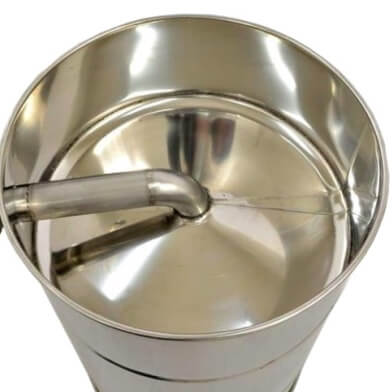 Lyson stainless steel premium 30L (8 gal) bottling tank. Features a conical bottom with welded stainless steel pipe (from tank center) to allow draining of the tank without tipping it.