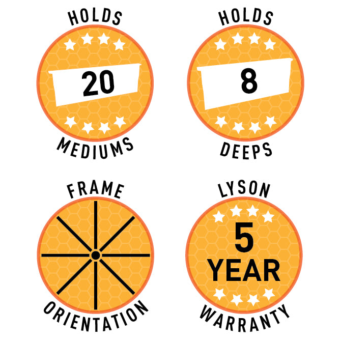 Save space and time with the Lyson's compact 3-in-1 extractor, uncapping table/support tank, and vertical strainer. A user friendly workspace allows you to uncap and move frames directly into a 20 frame radial extractor while a set of stainless steel sieves strains wax cappings and settles honey with that of the extracted honey for one combined source coming from the tanks honey gate.