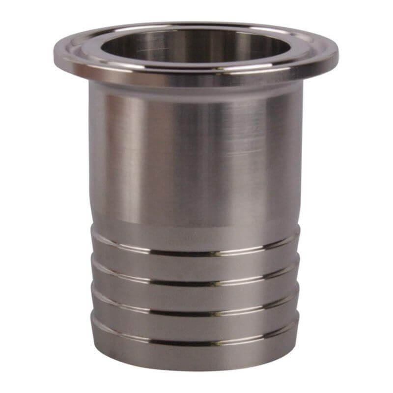Barb on one end fits 40mm ID rubber hose that is included with Lyson bottling machines. It is a tight fit into 1.5" hose such as our item HOSE15. Hose clamp not included. The other end is 1.5" Sanitary or "Tri Clamp" fitting (measures 2.0" across).