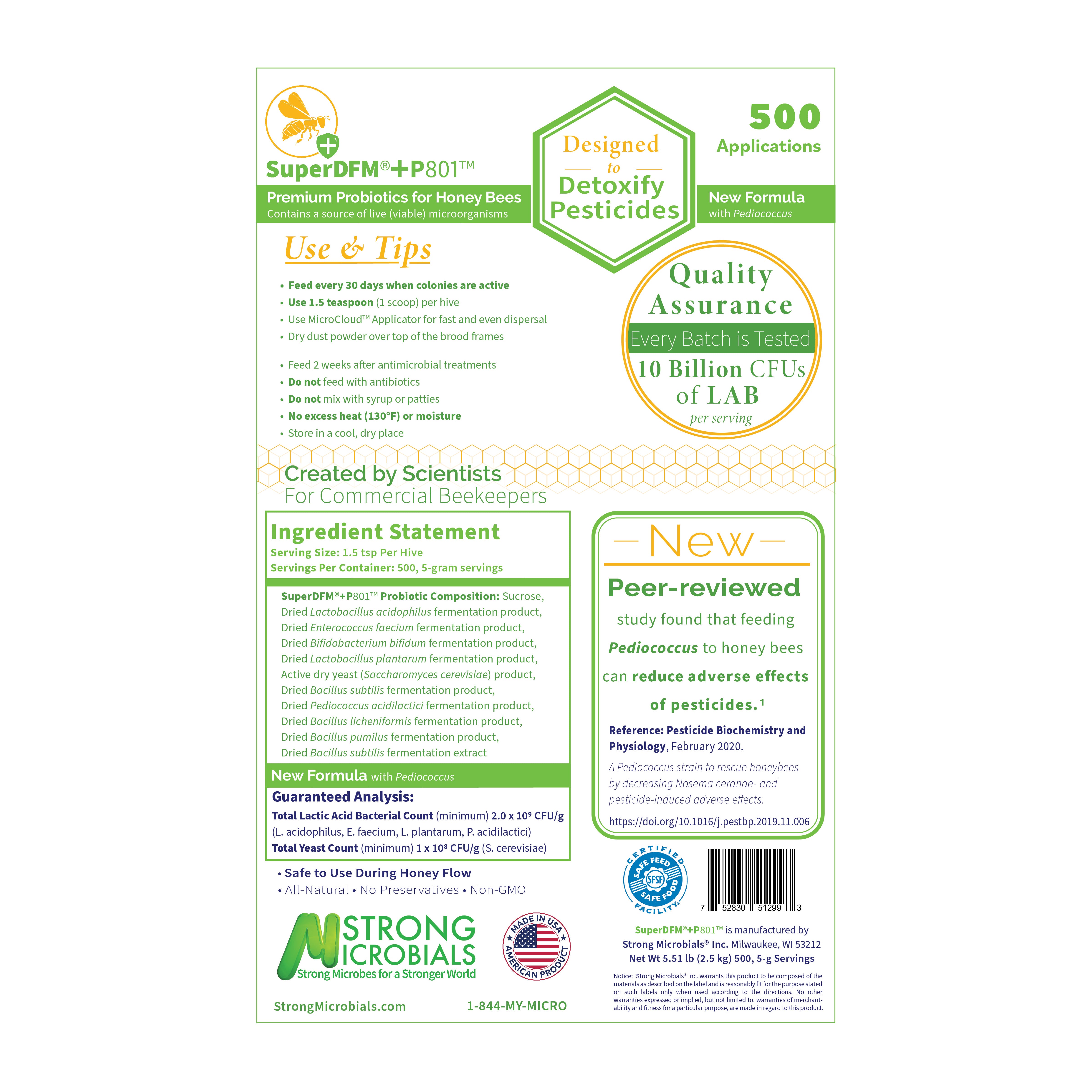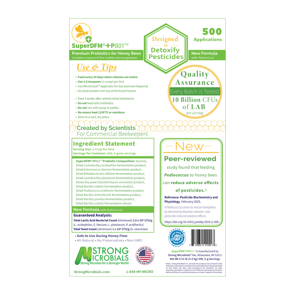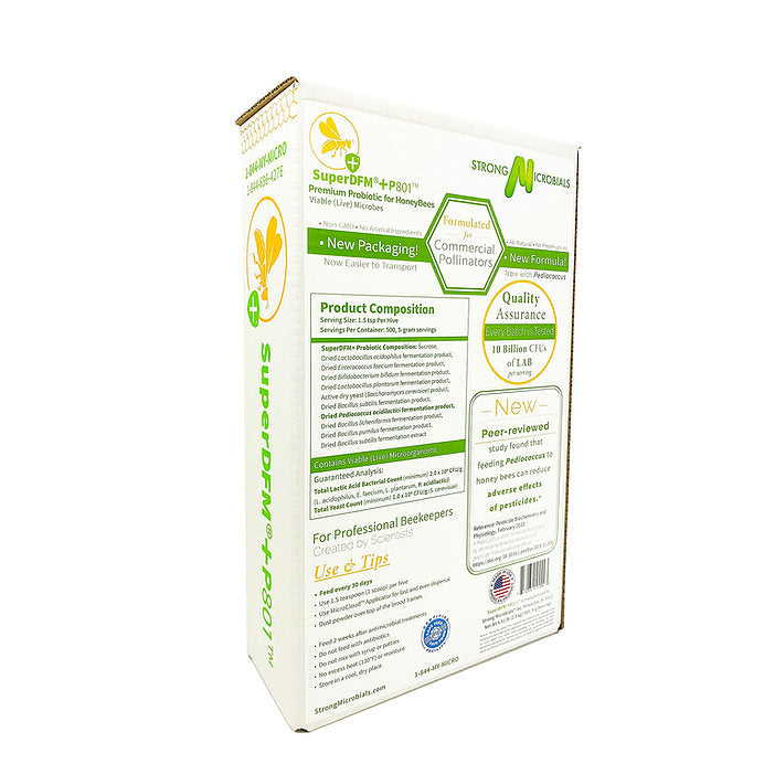 SuperDFM® empowers healthy digestion and optimal nutrient absorption. It replenishes the natural microbes lost due to agricultural modifications of the honey bee environment, such as pesticides, fungicides, and herbicides, which are all antimicrobial and destroy microbes that honeybees would naturally forage. The microbes in SuperDFM® have been scientifically shown to reduce chalkbrood, reduce pathogens, and strengthen immunity. Now, SuperDFM®+P801™ includes the bacteria Pediococcus, which has been shown to rescue honeybees from the adverse effects of pesticides!